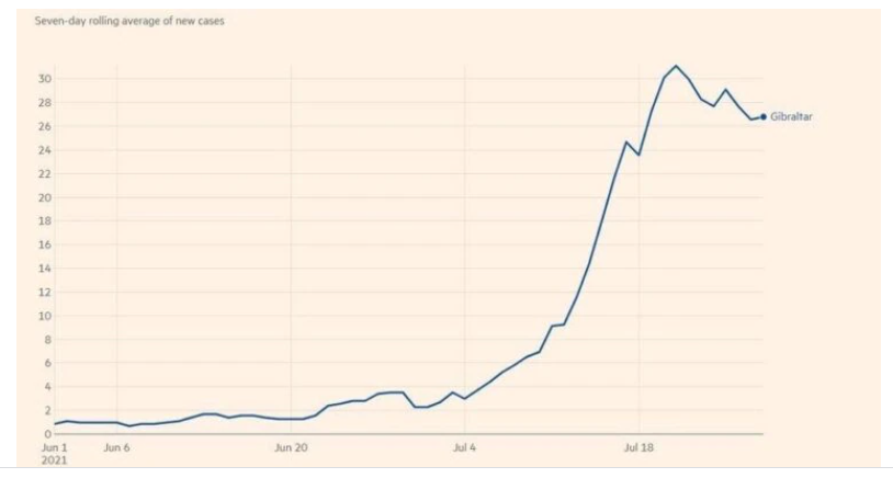 Gibraltar, qui a atteint un taux vaccinale de 99% au 1er juin, connaît désormais un pic incroyable de cas.