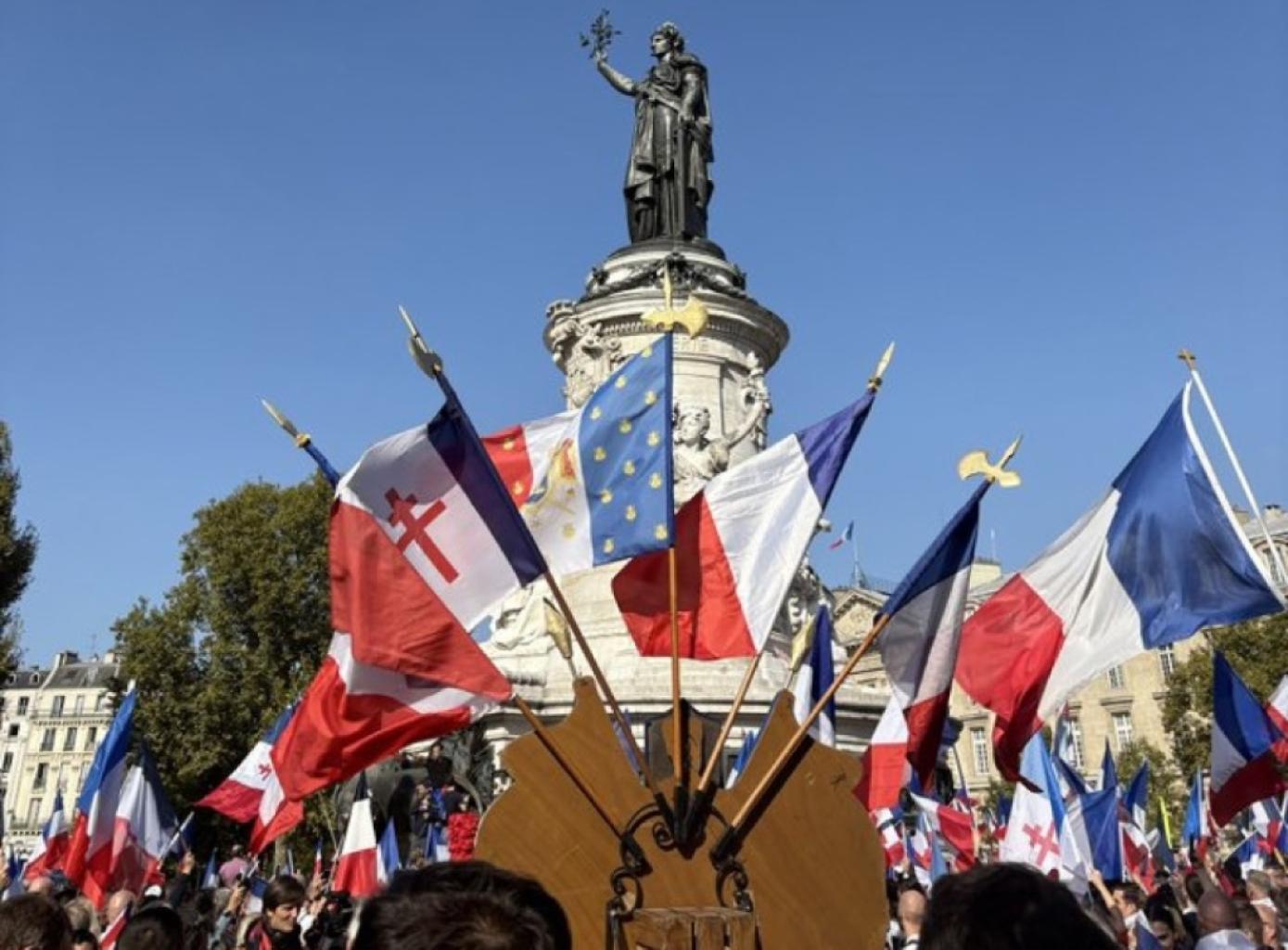 #webtube : Des milliers de Français se sont réunis place de la République à l’appel de @ben_le_patriote pour la « marche des patriotes ». La place de la République est remplie de drapeaux tricolores… qui servent même à masquer les tags laissés par les manifestations de gauche !