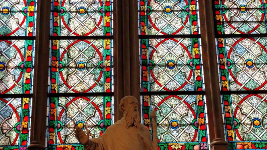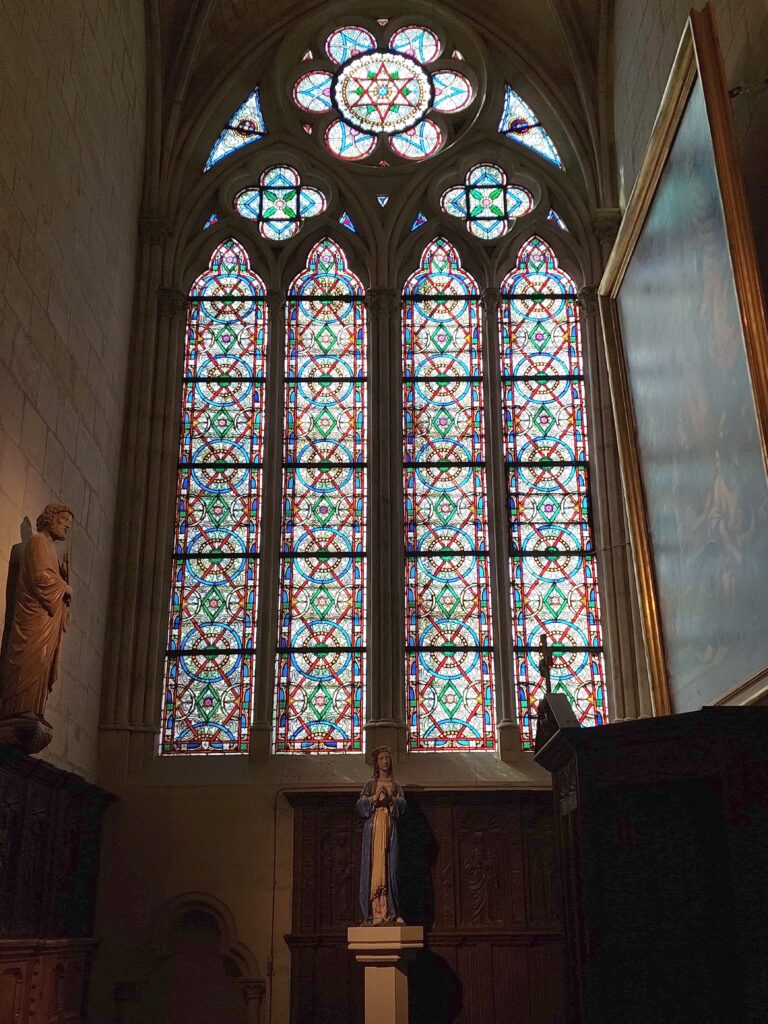 Qu’apporteront les vitraux de Claire Tabouret, à part perturber un équilibre délicat ? « Grisailles », c’est ainsi qu’on qualifie les vitraux de Viollet-le-Duc, et qu’on les disqualifie. Ils colorent très bien les cinq chapelles latérales sud concernées par ce truchement de verrières. Voyez la chapelle Sainte-Clotilde. Il s’y mêle du XVIe (les boiseries), du XVIIe (un tableau de Poerson) et beaucoup de XIXe : autel, statue, confessionnal, et de ces vitraux de Viollet-le-Duc. Reconnaissons à ce XIXe, qu’on a pu juger intrusif en la matière, qu’il a pour lui, ici, de mettre en valeur ce qui doit l’être. Du XIXe siècle, Claire Tabouret, elle, n’a qu’un anachronique diplôme des beaux-arts qui ne certifie en rien qu’elle ait le goût nécessaire à de tels arrangements.